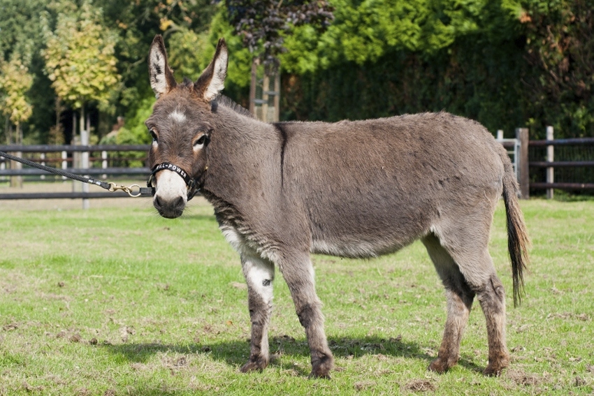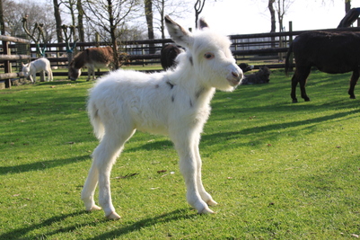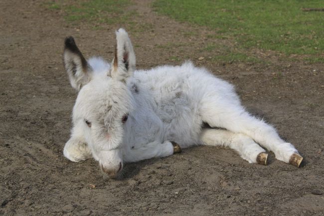 Een zeer bijzonder ezeltje in een aparte kleur, bijna helemaal wit met her en der een zwarte " spot"